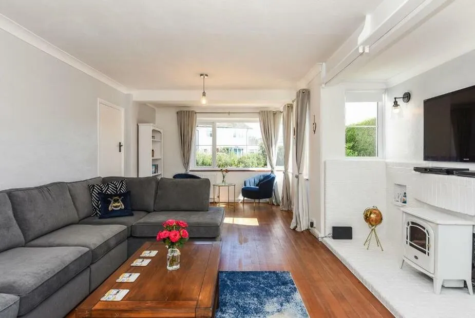Relax in the bright and spacious living room, featuring comfortable seating on a large L-shaped sofa. Enjoy views through generous windows, natural light on the warm wooden flooring, and a cosy electric fireplace for cooler evenings. Perfect for unwinding after a day of adventures.