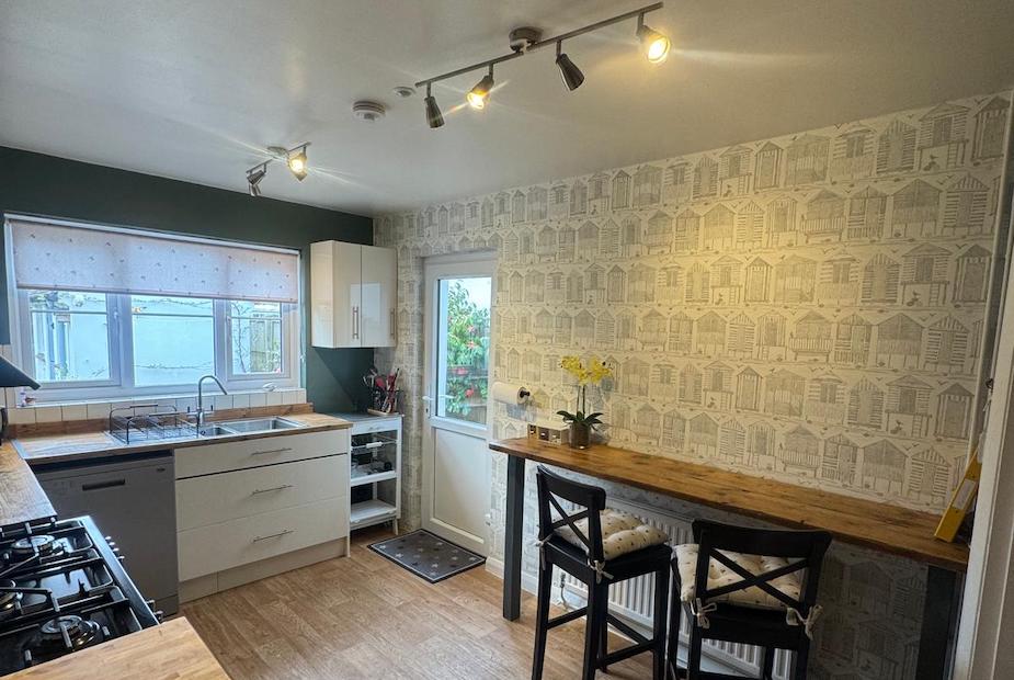 Discover our charming, well-lit kitchen! It features modern appliances, wooden worktops, and a unique beach hut accent wall. Enjoy casual meals at the rustic breakfast bar, perfect for holiday living. A back door offers convenient garden access.