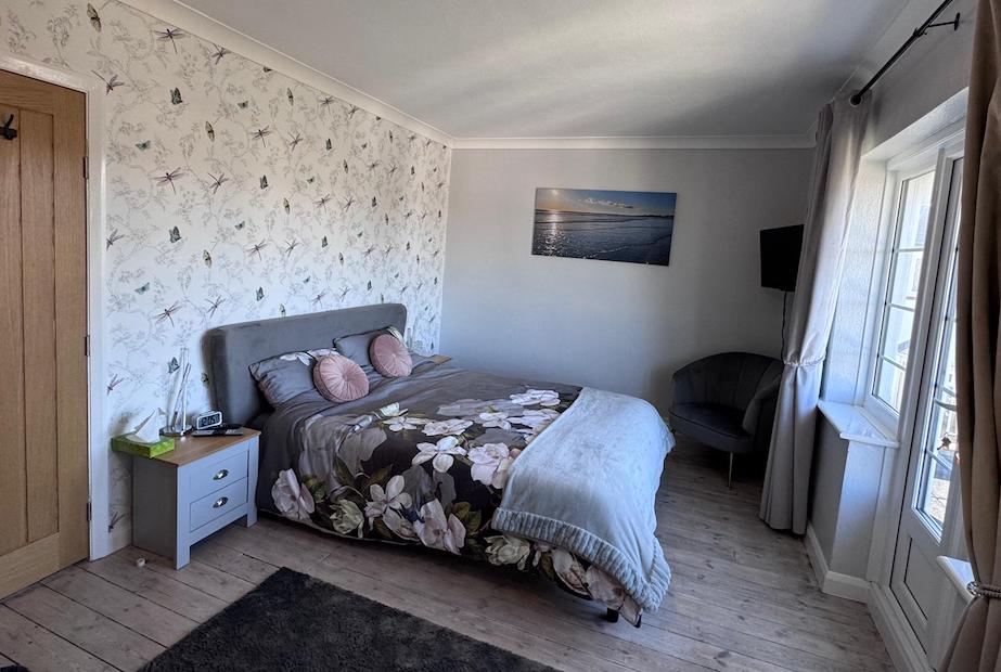 This inviting king sized bedroom offers comfort and style. Featuring a plush bed with elegant floral bedding, charming dragonfly wallpaper, and natural light from the window, it’s a serene retreat. Enjoy modern amenities like a bedside clock and a wall-mounted TV for a relaxing stay.